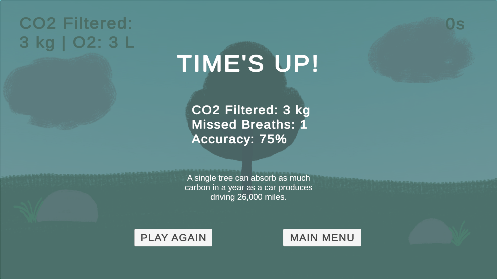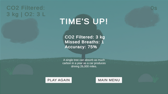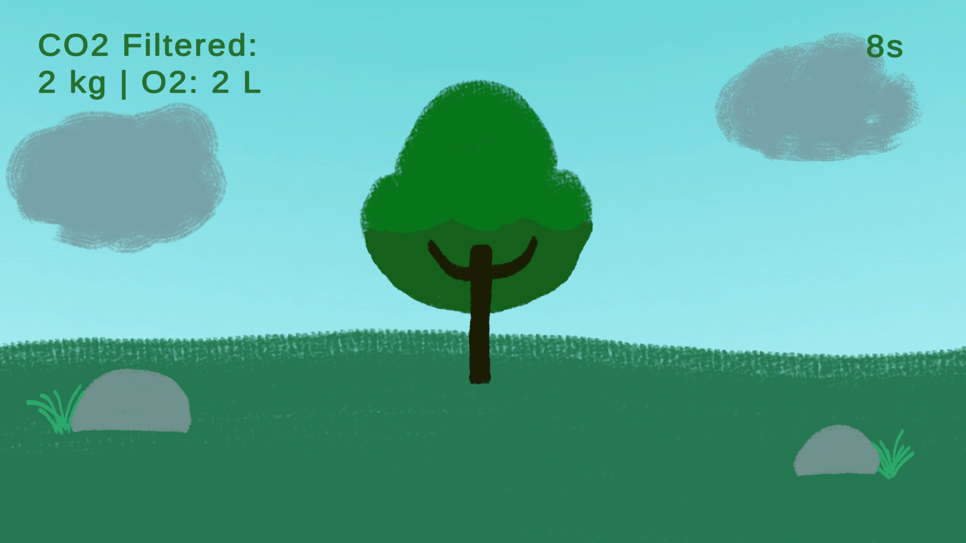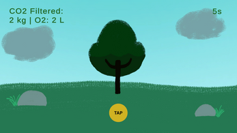 The tree darkens as it pulls CO2 from air. When the tree is fully dark, a prompt appears asking you to tap (or press the spacebar) to help it finish its breath cycle and release oxygen into the air. Every time you tap, the speed increases, pushing you to match nature's quickening rhythm.